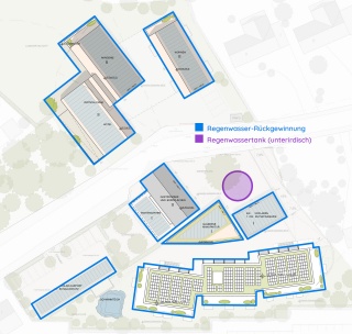 Alle Gebäude fangen Regenwasser auf und leiten es an den zentralen Speicher unter dem zukünftigen Marktplatz weiter. Von hier aus wird es gefiltert und aufbereitet, um als Brauchwasser für alle WC-Spülungen und Duschen des Areals verwendet zu werden. Insbeondere der hohe Bedarf in den landwirtschaftlichen und gastronomischen Spülprozessen kann so umweltschonend gedeckt werden.