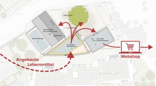 Die erzeugten Lebensmittel werden in der Manufaktur zu Produkten verarbeitet, die dem ansässigen Restaurant, den Anwohnern und Nachbarn sowie überregionalen Abnehmern aus Gastronomie und Privathaushalten angeboten werden. Auf dem zentralen Marktplatz sind Wochenmärkte geplant, die mit zusätzlichen Ständen aus dem Umland ergänzt werden.