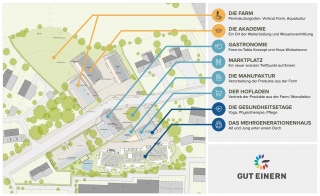 Alle Lebensmittel, die wir hier in hochwertiger und nachhaltiger Weise produzieren werden, sollen über den Hofladen und auch mit Lieferangeboten den Nachbarn angeboten werden. An Wochenenden wollen wir unterschiedliche Märkte auf dem Platz vor der Gastronomie organisieren und damit gerade unseren Nachbarn ein zusätzliches und neues Angebot machen. Nachbarn die sich zukünftig ein Leben in einem Mehrgenerationenobjekt vorstellen können und gerne auf Einern bleiben möchten, werden bei uns willkommen sein und natürlich stehen allen auch die medizinischen Angebote offen. Sollten sie einen attraktiven Ort zum temporären Arbeiten suchen, weil das Homeoffice nicht perfekt ist, finden sie bei uns ein entsprechendes Angebot in unserem Workspace. Wer einen festen Arbeitsplatz oder eine Aushilfsstelle in einem innovativen landwirtschaftlichen Projekt, der Gastronomie, Manufaktur oder einem Lernort sucht, kann bei uns fündig werden. Unsere kostensparenden Mobilitätsangebote wollen wir für unsere Nachbarn öffnen und unser Wissen zu allen Themen, vor allem auch den Energie- und Ernährungsthemen, teilen. Deshalb werden wir regelmäßig Workshops anbieten, bei denen auch unsere Nachbarn lernen können, wie sie ihre eigenen Immobilien energetisch zukunftsfähig machen – und dann, gerne auch mit unserer Unterstützung, diese Massnahmen konkret umsetzen können. Im Ganzen sind wir bereit, unsere langjährige Erfahrung im Bereich der Quartiersentwicklung hier einzubringen um dem ganzen Quartier zu einer Aufwertung und den Menschen zu noch mehr Miteinander und damit mehr Lebensqualität zu verhelfen.