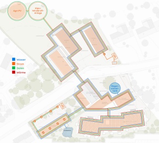 Entscheidend für das Gelingen dieser nachhaltigen Energieversorgung ist, dass sämtliche Gebäude miteinander vernetzt werden und damit ein hochmodernes Strom-, Daten-, Wasser- und vor allem ein Wärmenetz entsteht. Nur dadurch ist es möglich, die Erzeugung von Energien in und an allen Objekten, mit den Verbräuchen in und an allen Objekten, zu kombinieren. Damit entfalten sich Flexibilität und Effizienz, die zur Wirtschaftlichkeit des Systems beitragen. Durch diese Vernetzung kann zum Beispiel die enorme Abwärme der »Vertical Farmcontainer« als Heizungsanlage für die Wohn- und Bürogebäude dienen. So können die Elektroautos über Nacht zum Stromlieferanten der Gebäude werden. Es entstehen Stoffkreisläufe, ganz im Sinne der Kreislaufwirtschaft.