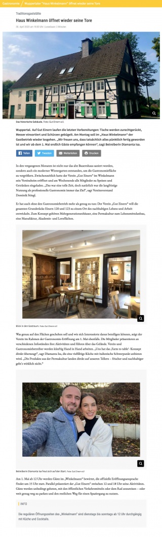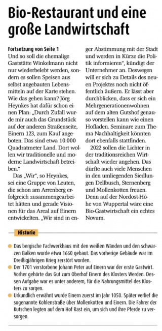 Verschiedene Nutzungen sollen auf GUT EINERN so kombiniert werden, dass sie voneinander profitieren. „Zu den Bausteinen des Konzepts gehören generationenübergreifendes Wohnen, Landwirtschaft, eine Akademie und auch eine neue Gastronomie“, erklärt Initiator Jörg Heynkes das Konzept. Er hat gemeinsam mit seiner Partnerin Silke Wilke die beiden Grundstücke an der Grenze rund um das alte „Haus Winkelmann“ gekauft und möchte ihnen nun ein neues Gesicht geben.